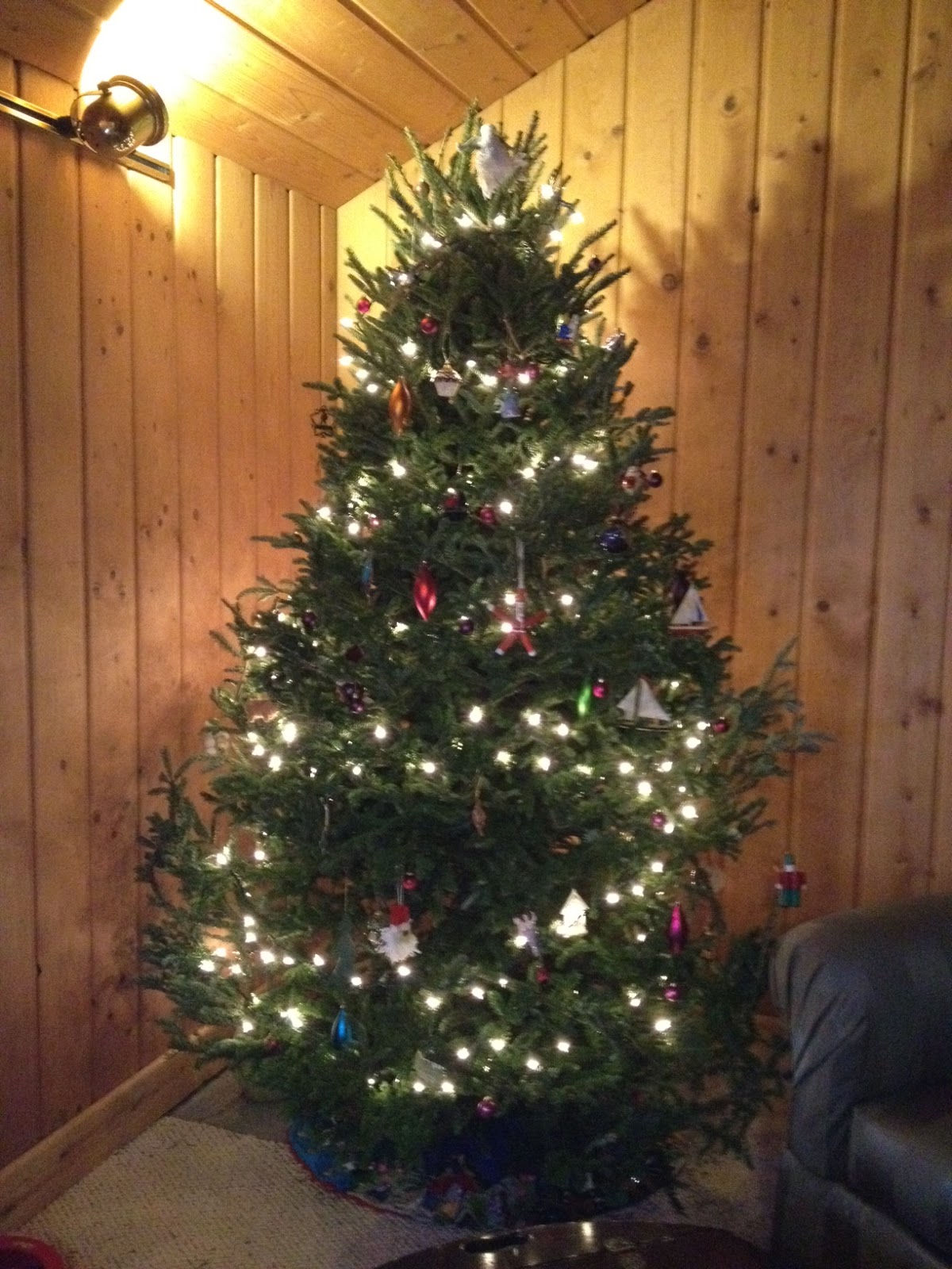This year, rather then spend a morning driving out to the forest to cut a tree down ourselves (a tree permit is only $10!) we decided to save our time, money, gas, and sanity and go to Home Depot. We found this perfect frasier fir for $30! Of course, our stand wasn't big enough, so after some Goodwill hunting (ha!) we found one for $5! Tip: after buying a tree stand at Goodwill for $5 do a quick test and fill it with water BEFORE setting up your tree. It may have a crack in it that needs to be epoxyed. Just sayin.' Also, another tip: test lights by plugging the strands in before putting on tree. Again, just sayin'